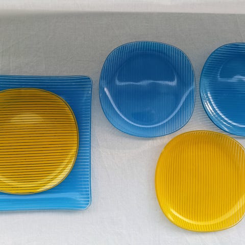 Riihimäen lasitehtaan konepuhallettuja lautasia 1950-60 luvulta. Kotimaiset lautaset ovat pyöreitä ja niissä on koristeellinen kuviointi, pohjassa keskellä kohokirjaimin R. Halkaisija 12,5 cm. Tunnettu aikoinaan nimellä pullalautanen. Sopivat erinomaisesti tarjoiluun tai koristekäyttöön.