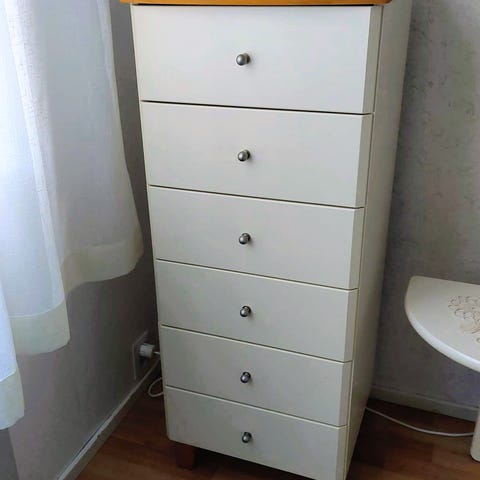 Valkoinen kaappi Koko Leveys 125 cm korkeus 88cm syvyys 45 cm Kolme veto laatikkoa ja kolme avattavaa ovea. esm liina Vaatteille ( hyllyt on ). Kansi on viilutettua koivua!!: Hyvä.ON . pyynti 350 E: Hinta tiukka.