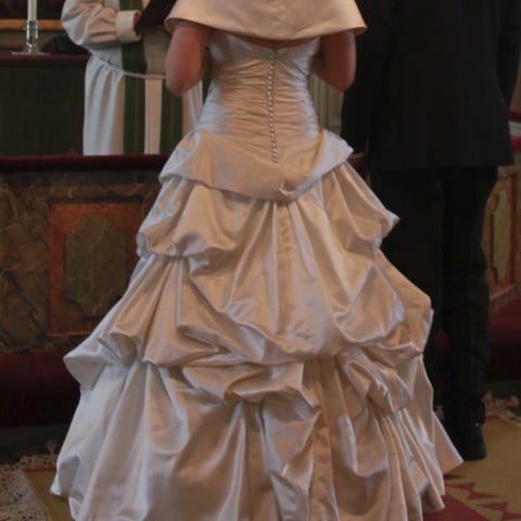 Valkoinen A-linjainen hääpuku, jossa päällikerros pehmeää tylliä ja alempi kerros satiinia. XS kokoinen. Koristekirjailua. Ollut käytössä kerran ja nyt säilytyksessä monta vuotta. Selässä nyöritys. Takana nappi laahuksen nostoa varten. Oma pituuteni on noin 164cm ja jalassa oli matalat korkokengät, jolloin puvun pituus oli sopiva. Mukaan myös vanteellinen alushame. Voin postittaa ja saa myös tulla Hyvinkäälle sovittamaan.