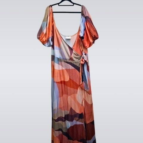 Koko 50, vyötärönauha joustava, venyttämättä 46 cm. Pituus vyötärönauhalta helmaan n. 77.