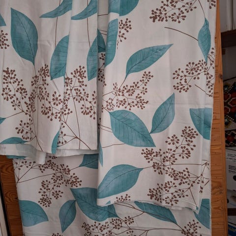 Verhokangaskaistaleita, ohutta luonnonvalkoista. Osa on ennestään ommeltu, joten ne ompelukset voi hyödyntää tai unohtaa omaa ideaa häiritsemästä. Tässä mittoja leveys x pituus: