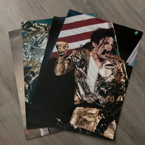 HiStory -kiertueella Helsingissä olympiastadion 24.08.1997.Konsertin alkuperäiset julisteet 5 kpl. Iso 69*50,1 kpl. pienet 24*32 4 kpl kaikki uusia ei ole ollut seinällä ym. Myydään yhdessä tai erikseen. iso 230,00 pienet 70,00 kpl, Yhteis- hinta nyt 300€+avaimenperä,rintanappi,muki,lippu (myydään yhdessä)=50,00. Tai kaikki nyt 340€.Nouto, jos postin kautta niin + kulut