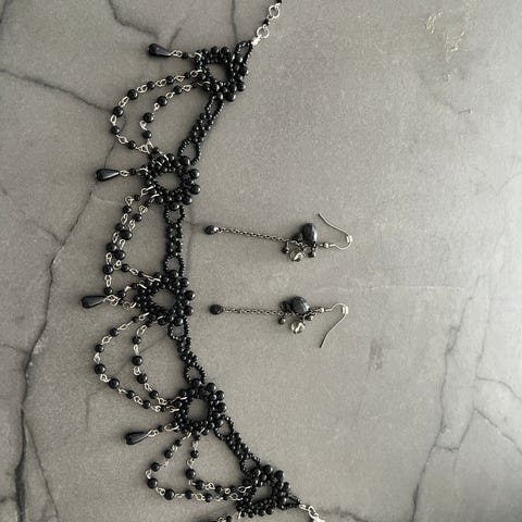 Myydään kaunis ja hyväkuntoinen korusetti. Sisältää kaulakorun ja riippuvat korvakorut. Riipuksen ja korvakorujen materiaali metallia, ketjussa metallia, nahkaa ja helminauha. Myydään vain settinä. Lähetettäessä postimaksut (6€) lisätään tuotteen hintaan.