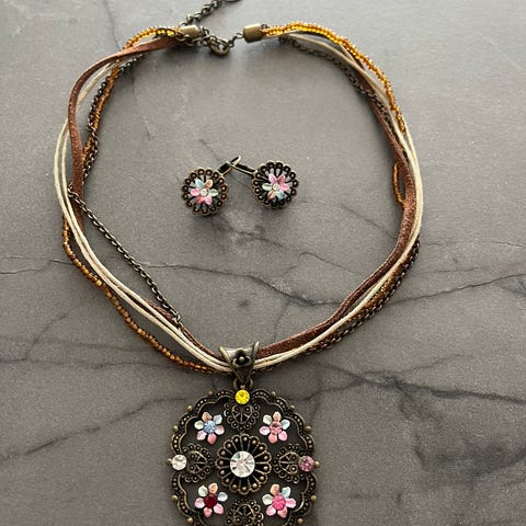 Myydään hyväkuntoinen korusetti, jossa kaulakoru ja riippuvat korvakorut. Helmet muovia, ketjut metallia. Myydään vain settinä. Lähetettäessä postimaksu (6€) lisätään tuotteen hintaan.