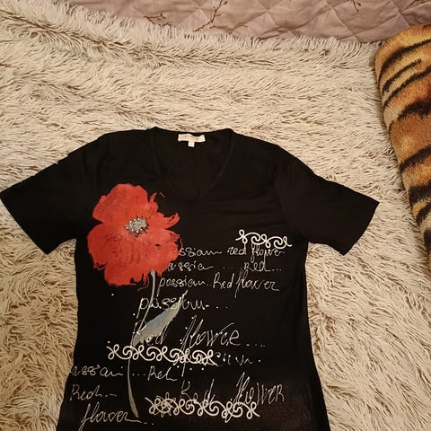 Musta t-paita kokoa S. Edessä valkoinen palmukuviointi.