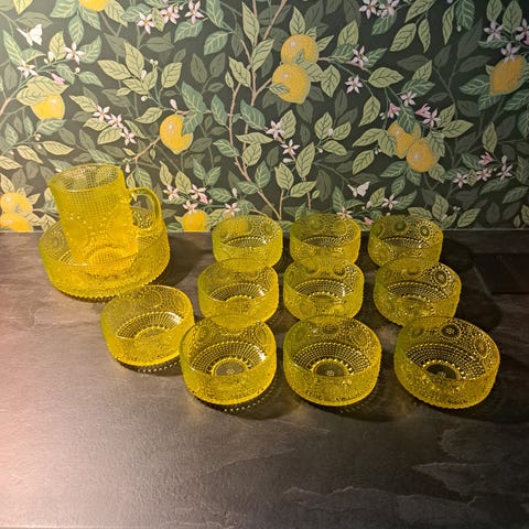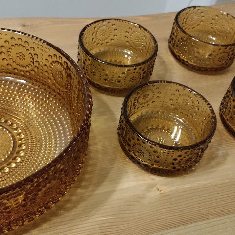 Hyväkuntoiset keltaiset Grapponia astiat: 5 kpl jälkiruokakulhoja ja iso tarjoilukulhoon.