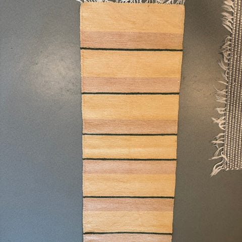Käsin kudottu poppana. Pituus 101 cm, leveys 36 cm. Siisti. Kudottu ostokuteista