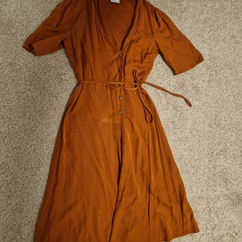 Hurmaava ja laadukas kauniin värinen mekko Kaffelta. Rinnan alta alas saakka vuorattu. Kangas on upeasti hohtavaa, väreinä kaunis aprikoosi/oranssi, lohenpunainen ja luonnonvalkoinen. Edessä ihanat kukat, joista osa on ommeltu päälle. Olkaimissa on takana joustopoimutus. Selässä ylhäällä koko leveydeltä smokkirypytys parantaa istuvuutta. Kaniisti levenevä helma. Toisessa olkaimessa on jokin tumma kohta, jonka yritin kuvata. En osaa sanoa, onko langassa vaiko likaa, mutta näyttää enemmän langalta. Mekossa on laput kiinni.