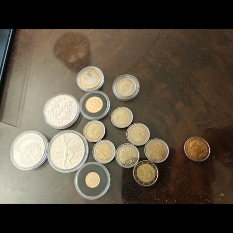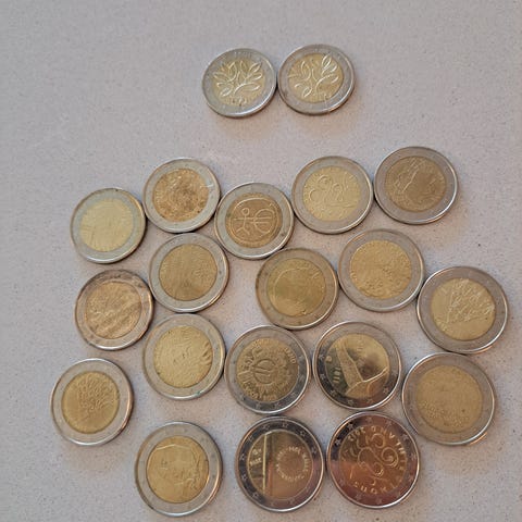 Myydään kokoelma hyväkuntoisia 2 euron erikoiskolikoita kaikkein mieluiten koko erä kerralla, mutta mahdollista myös pienemmissä erissä: Kokoelman nimellisarvo on 852 euroa. Kuvissa värit ovat epätasaisia valon heijastuksesta johtuen, mutta ovat luonnossa hyväkuntoisia ja tasaisen värisiä. Osa kolikoista ei ole ollut kierrossa. Kokoelma sisältää mm. 6 kpl "risurahoja" ja 4 kpl "pullarahoja". Myydään tarjousten perusteella.