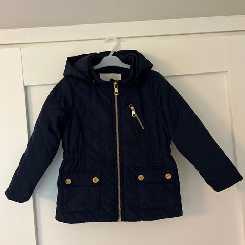 Violetti tikkitakki / syystakki koko 98cm. Kevyesti topattu, käy siis hyvin syksystä /keväästä ja autoreissuilla kylmemmillä keleillä. Huppu irrotettava, vetoketju taskut.