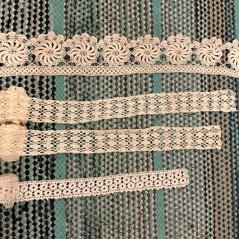Kuvan mukaista käsin valmistettua pitsiä kaksi eri palaa. Pitsien leveys on 6,5 cm ja pituus 67 cm.