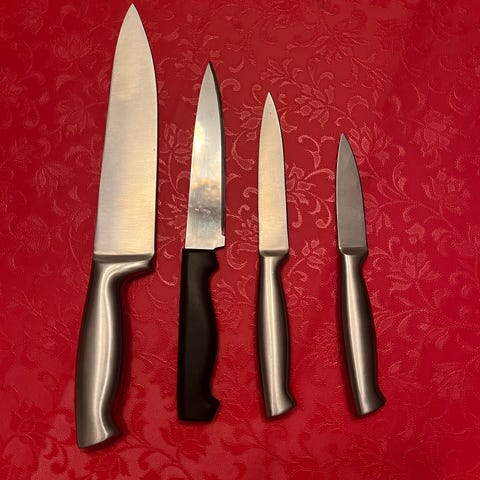 Erilaisia Veitsiä, Terät ruostumatonta terästä ja varret muovia ja puut, ehjiä.
