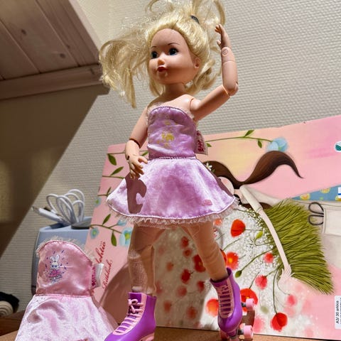 90-luvun rullaluistelija nukke. Toimii pattereilla. Nouto.