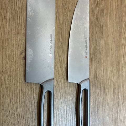 Veitsiä, terät ruostumatonta terästä ja kahvat muovia ja puuta, ehjiä.