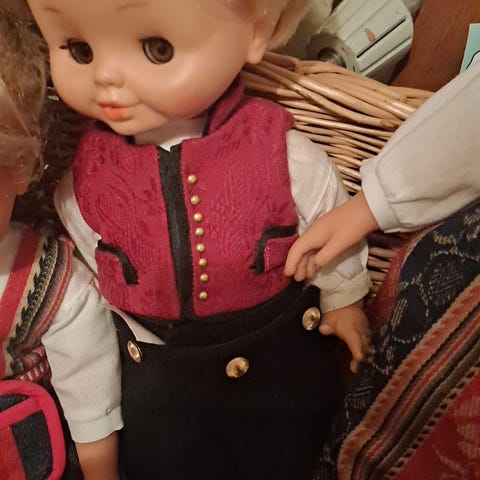 Läytyy myös nuken vaatteita. Suomalaista käsityötä. Äitini valmistamia, osaan kansallispuvuista ostettu myös asuihin sopivat korut.