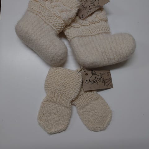 Vastasyntyneelle vauvalle töppöset+peukalottomat lapaset -settejä.