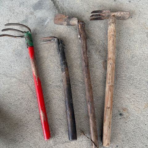 Vanha kolmipiikkikuokka punaisella puuvarrella. Kuokan korkeus 66 cm.