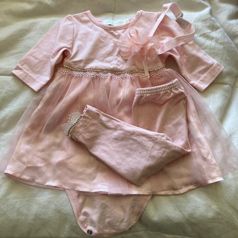Valkoinen uudenveroinen kotimainen ruusukuvioitu juhlamekko ja käytetty mutta hyväkuntoinen hellehattu.