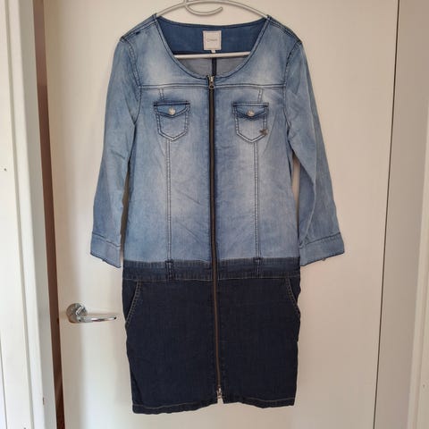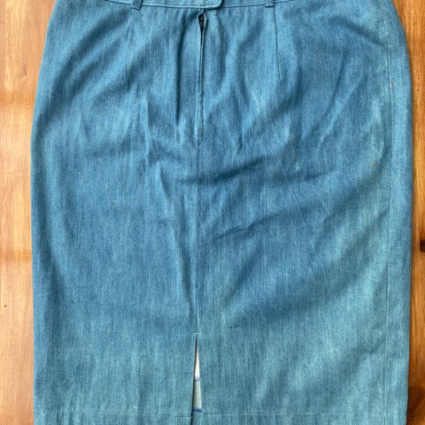 Farkkuhame koko 38. Edessä napitus, joten hame aukeaa edestä. Taskut.