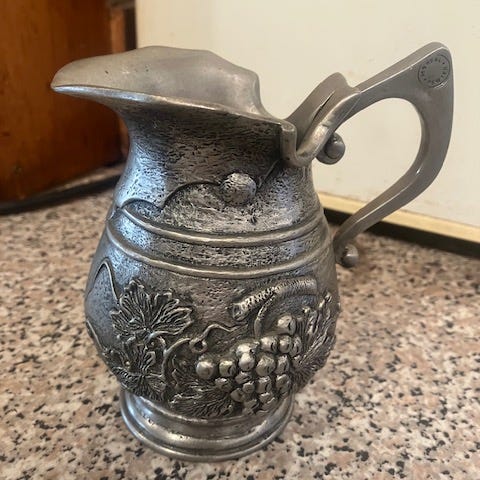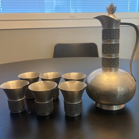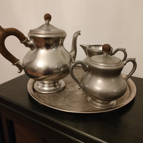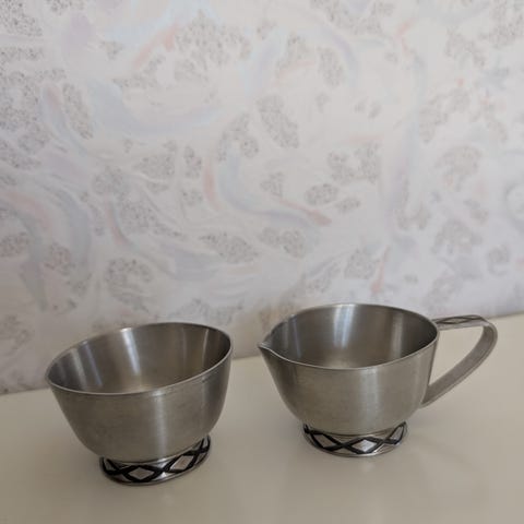 Sokerikko-kermakkopari on korkealuokkaista tinaa, sopii sekä kahvipöytään että koristeeksi. Molempien korkeus on 6.5cm, halkaisija 7cm. Valmistaja on amerikkalainen Old Colonial Pewter W.S.N. 1950-luvulla. Molemmissa astioissa on lähes huomaamattomat pienet painaumat. Pidän silti kuntoa hyvänä. Suomesta et löydä. Molempien pohjassa on valmistajan leima.