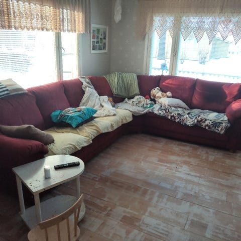 Istuin ja selkäosissa vetoketjut. Pesty ja talvella tuuletettu kovassa pakkasessa. Divaanin kätisyys ei ole vaihdettavissa.