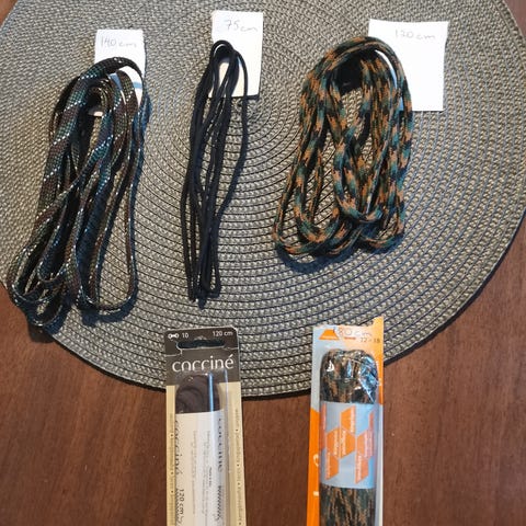 Myyn erilaisia kengännauhoja 50gr eli noin 13-14 kpl miten nyt saan ne pakattua tavalliseen kirjeeseen. Siinä on mustia ja erivärisiä ruskeita. On ohuempia ja paksumpia ja pituudetkin hieman vaihtelevat.