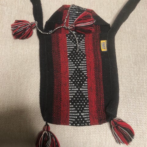 Musta puuvillakankainen olkalaukku.