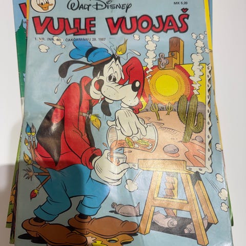 LÖYTYY WALT DISNEY paljon erilaisia,VULLE VUOJAS--Saamenkielisiä Aku Ankkoja (1-14/1987 (14 B puuttuu) 15-23/1988,sekä irtonumerot:2 kpl N:o 29-1988/-2 kpl N:o 26/-1988/-2 kpl N:o 17/-1988/-3 kpl N:o 27 -1988/-2 kpl N:o 18 -1988/-3 kpl N:o 27 -1988/1 kpl 1988:30,31,22,24,20,21 -2 kpl N:o 19 -1988 ja MIKI HIIR-Eestin kielisiä Aku Ankkoja paljon erilaisia alkaen N:o 0:sta,(mitä numeroa etsit?)joku voi olla Venäjänkielistä Akua!-Tee tarjous-jos riittävä otan yhteyden.Jos et saa tarjoukseen vastausta,se ei ollut riittävä. Tilaus/raha meille ja lehdet postiin.Ostaja maksaa postituksen.Kunto hyvä-tyydyttävä.Ei luettuja!-suopursu@gmail.com MYÖS TAULUT MYYNNISÄ,Osmo A.Mäkelä,Kokkola,yli 40v.maalannut.Sijoituskohde!