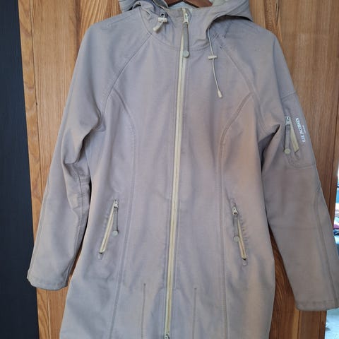 Ilse Jakobsenin tuulta ja vettä kestävä takki. Takin pituus on suunnilleen puoliväliin reittä.