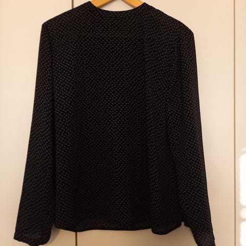 Naisten täysin musta (kamera vääristää väriä) paita pusero joka muuten hyvässä kunnossa, mutta molemmista koristeista puuttuu 1 timantti. Ei sitä kyllä huomaa ellei ala tuijottamalla tuijottaa. Katso kuvat.