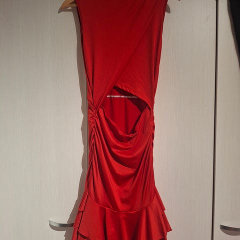 Kuvan viininpunainen mekko myynnissä. Koko noin 40. Kauniisti laskeutuvaa kangasta; lapussa lukee viscose 60%, acetate 30% ja elasthanne 10%. Vain nouto.