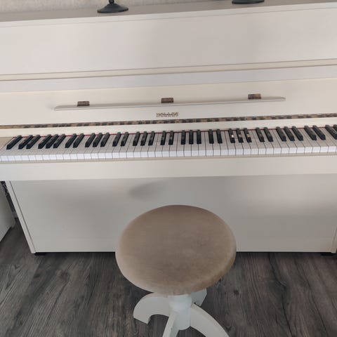 Arvopiano Schimmel, vuosimallia 1964, Renner-koneistolla. Ollut kahdella omistajalla. Kesällä 2013 pianoteknikon perusteellisesti huoltama ja virittämä. Hän sanoi pianon olevan hyväkuntoinen ja vähän soitettu. Sen jälkeen ei soitettu. Täyttä puuta koko piano. Korkeus 108 cm. Tällä soitat vielä vuosikymmeniä. Erittäin kaunisääninen. Kuvassa oleva tuoli kuuluu mukaan. Valokuvassa valo vaalentaa osaa kuvasta, piano on kauniin keskiruskea. Tule katsomaan ja koesoittamaan ennen ostopäätöstä.