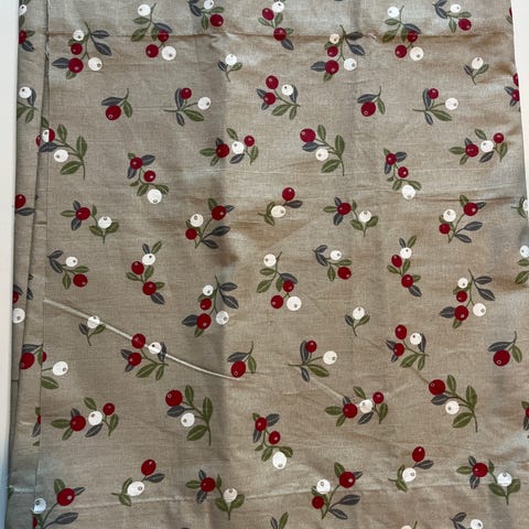 Aivan uutta kangasta noin 260 cm. Päätyjä ei ole ommeltu, koska ei tullut koskaan käyttöön. Kankaasta voi leikata haluamaansa tarkoitukseen sopivan määrän tai laittaa ikkunaan sellaisenaan. Ei ole purkautuvaa eli ei ole pakko ommella reunoja (omasta mielestäni).