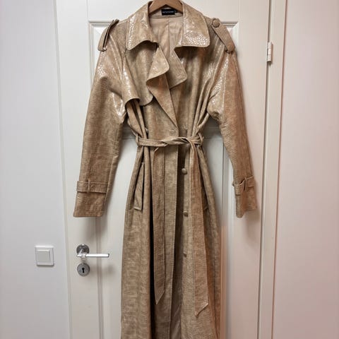 P.T.A takki beige väri, naisten koko 38. Takissa on pitkä hiha, napit edessä ja vaaleanpunainen vuori. Sopii käytettäväksi erilaisissa tilaisuuksissa.
