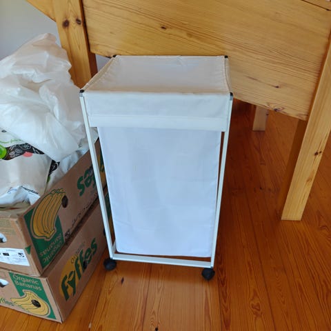 Orthexin pyöreä, umpinainen pyykkikori (ehkä Rondo). Matala, ollut meillä jonkin kerran käytössä myös lapsen ammeena mutta pääasiassa puhtaan pyykin korina.