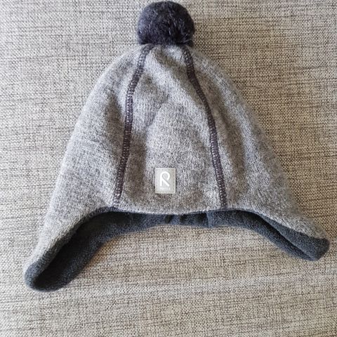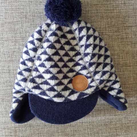 Tumman sininen, lämmin Reiman fleecevuorillinen hattu, koko 50. Päällinen villaa. Nauhakiinnitys. Vähän nukkaa päällisessä.