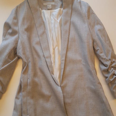 Harmaa, pehmeää kangasta, takki koko noin 38. Siisti, kapeahko vyötäröstä. Olkatoppaukset.