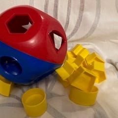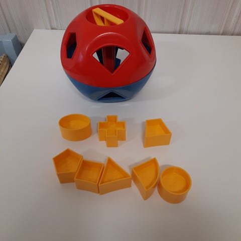 Vanha Tupperware -lelu. Pallon sisällä erimuotoisia palikoita, joita laitetaan sisälle samanmuotoisista rei'istä. Palikat saa ulos pallosta vetämällä päädyissä olevista kahvoista samaan aikaan, pallon puolikkaiden väli aukeaa ja palikat tippuvat ravistelemalla pois. Opettaa hahmottamaan erilaisia kuvioita. Kymmenen palikkaa. Pallon halkaisija 16 cm. Ehjä, kaikki palikat tallessa. Palikoissa vielä numerot sisällä kohokuvioin. Postitus tai nouto.