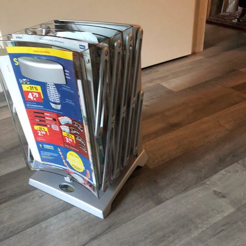 Haitari mallinen esiteteline, kaksipuoleinen. Max. A4 esitteille/lehtisille. Huurrelasia ja alumiinia. Helppo koota ja kasata, menee pieneen tilaan. Korkeus koottuna noin 120cm. Ollut yhden kerran esillä messuilla, virheetön. Mukaan kova kantinen salkku missä helppo kuljettaa/säilyttää.