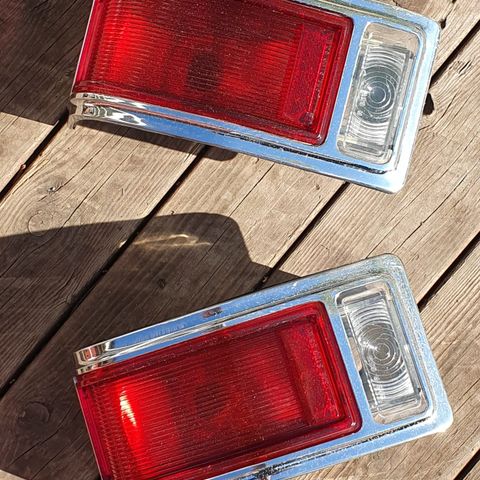 Coronetiin neliönmalliset peruutusvaloumpiot. Sisältää lamppujen rungot ja erilliset kirkkaat linssit. Käyttämättömät eli NOS-osat.