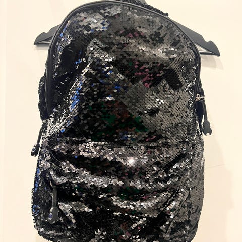 Pieni musta paljettireppu on kokoa korkeus 16,5cm, leveys 10cm ja syvyys 14,5cm, hihnan pituus 73cm sisällä on yksi tasku ja nuorikiinnitys.