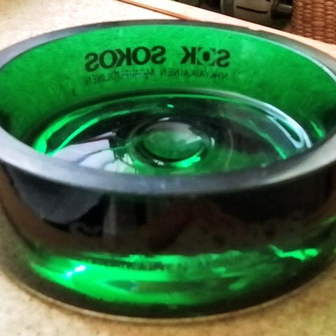 soveltuu ylösalaisin käännettynä myös jalustaksi muille taide-esineille,pohja ja reunat koristepoltettu tummiksi, 5eur