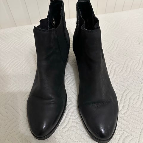 Ziosta pari vuotta sitten ostetut mustat nahkanilkkurit. Koko 41. Varsi mustaa mokkaa. Käytetyt mutta edelleen hyvässä kunnossa, myyn kun olenkin enemmän teräväkärkisen ystävä. Pohjiin laitatettu suutarilla osittaiset kumipohjat. Ei vetoketjua vaan sujautettava malli. Puukorko. Hyvät jalassa. Ovh 179e.