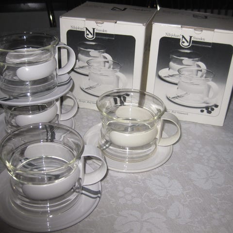 4 kpl Piccolo-Irish Coffee lasit, design Heikki Orvola, 2 lasissa Nuutajärven leimat, 1 lasissa Arabian leima, ja 1 lasin leima lähtenyt pois.Kaikki hyväkuntoiset, eikä naaarmuja.Korkeus 9cm, suuaukon halk.7cm, vetoisuus 1,5dl. Ei postitusta, koska lasi ohutta. Myyjän mukanakin tulee mm.JKL-Palokka-Kärkkäisen parkki/ Tre-Linnainmaa Lasit yht.10 e