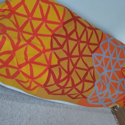 Värien toistuminen kuvista tietokoneellesi riippuu koneesi asetuksista sekä koneesi värintoistosta - kangas kuitenkin Marimekon valmistama ja Fujiwo Ishimoton suunnittelema.