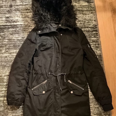 Uusi musta talvitakki jossa irrotettava huppu. Koko XS-S