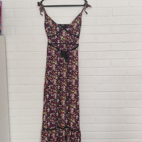 Only lähes käyttämätön mekko koossa XS. Mekko joustaa hieman ja sitä voi mielestäni pitää molemmin puolin. Periaatteessa v-kaula-aukko on kuitenkin tarkotettu taaksepäin / selkäpuolelle, sillä siellä myös kokolapun sijaitsevat.