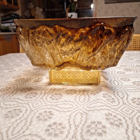 Hehkuvan värinen Kumelan lasimalja. Signeerattu (5.kuva), 24 karaatin kultaus.