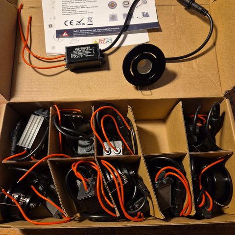 Kuusi LED-kohdevaloa esim. kattoon. Pyöreän reiän läpimitta n. 6 cm, teräksinen peitelevy n. 8 cm x 8 cm. Mukana LED-polttimot ja kytkentäjohdot. Kiinnittyy reikään kahdella jousella. LED-lamppujen kanta GU10. Kaikki valot ovat kuvanmukaiset.