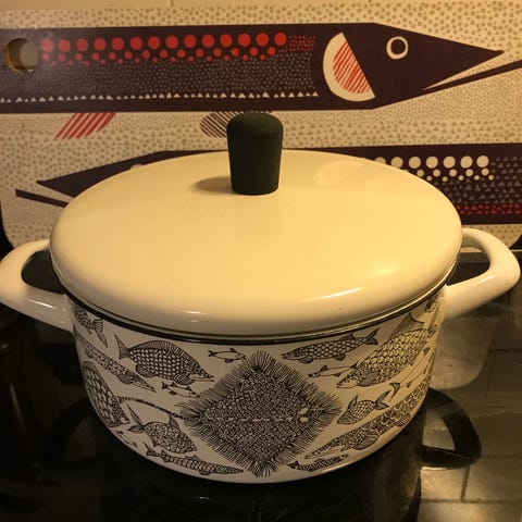 Esteri Tomulan Finelille suunnittelema emalinen Neptun kattila. Siistikuntoinen. Halkaisija 22, korkeus 15 cm. Lähetys tai nouto.